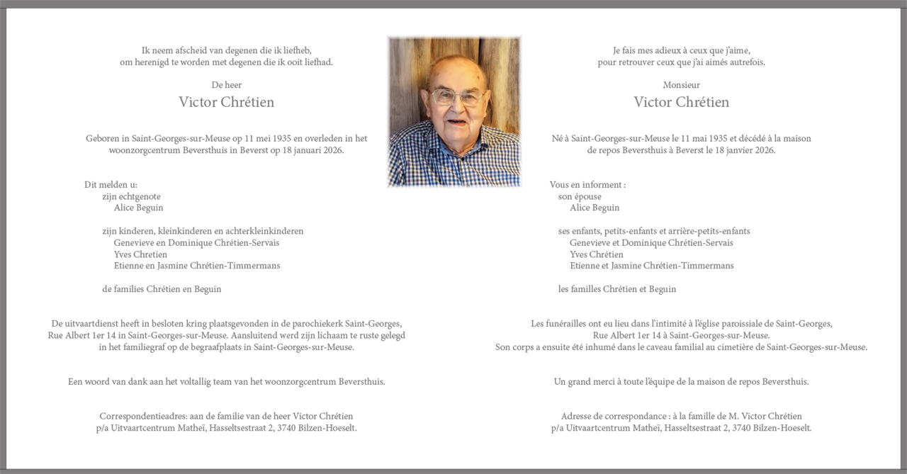 Décédé à Beverst (3740) le dimanche 18 janvier 2026 à l'âge de 90 ans